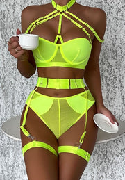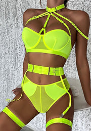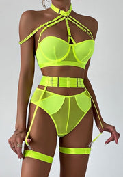 Ignite the passion of the moment with full intensity in this absolutely breathtaking bra set. Revel in the underwire cups adorned with adjustable strappy details, an adaptable choker neckline, a secure hook-and-eye back closure, a high-waisted garter belt with adjustable garter straps, wraparound leg garters, and a coordinating cheeky panty. Let desire take the lead in this sensational ensemble.