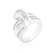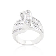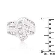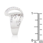 Channel set cubic zirconia stones in a diagonal design mingle together to create this classic overlapping cocktail piece. Our genuine rhodium finish is achieved using an electroplating process that coats the item with heavy layers of rhodium a close cousin to platinum which gives our jewelry a platinum luster.